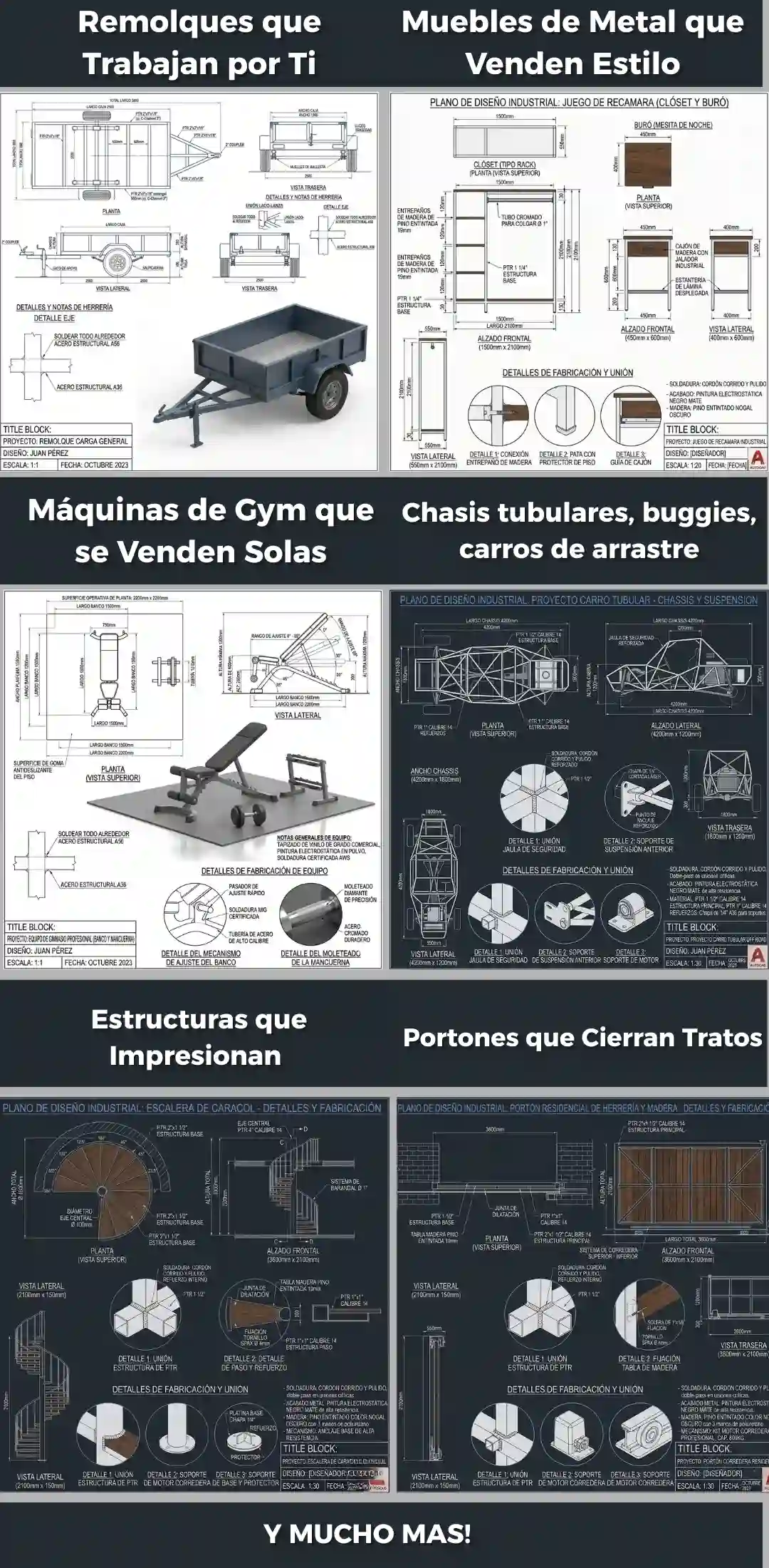 Fue entonces cuando empecé a recopilar y organizar los planos más solicitados del mercado: portones, barandales, escaleras, muebles metálicos y estructuras — con medidas reales, lista de materiales y precio de referencia incluido en cada uno.